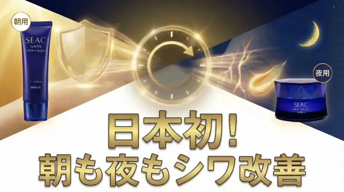シリーズ累計販売数1000万個を突破(※1)した自然派コスメブランドの「SEAC」が、40年間の研究結果を詰め込んだ、朝用・夜用オールインワン7年連続売り上げNo.1(※2)のシワ改善オールインワンです。