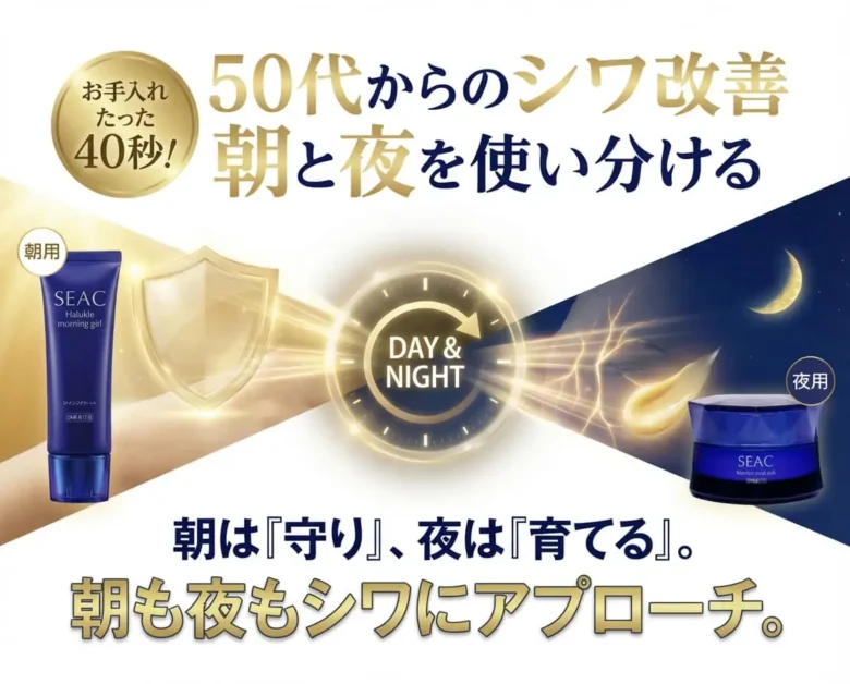 他の化粧品だと効果が一時的なのに対し、SEACは独自処方の朝用夜用がそれぞれシワを改善する革命的なスキンケアなんです。