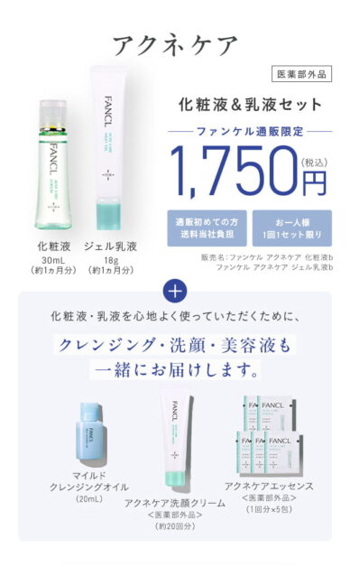 アクネケア化粧液とジェル乳液の本品に加え、洗顔クリーム、マイルドクレンジングオイルのミニサイズが特別セットになった、見逃せない限定オファーを実施中です。