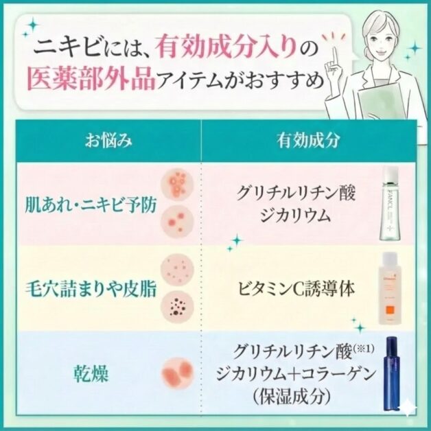 ①ニキビへ有効な成分が入っている医薬部外品を選ぶ