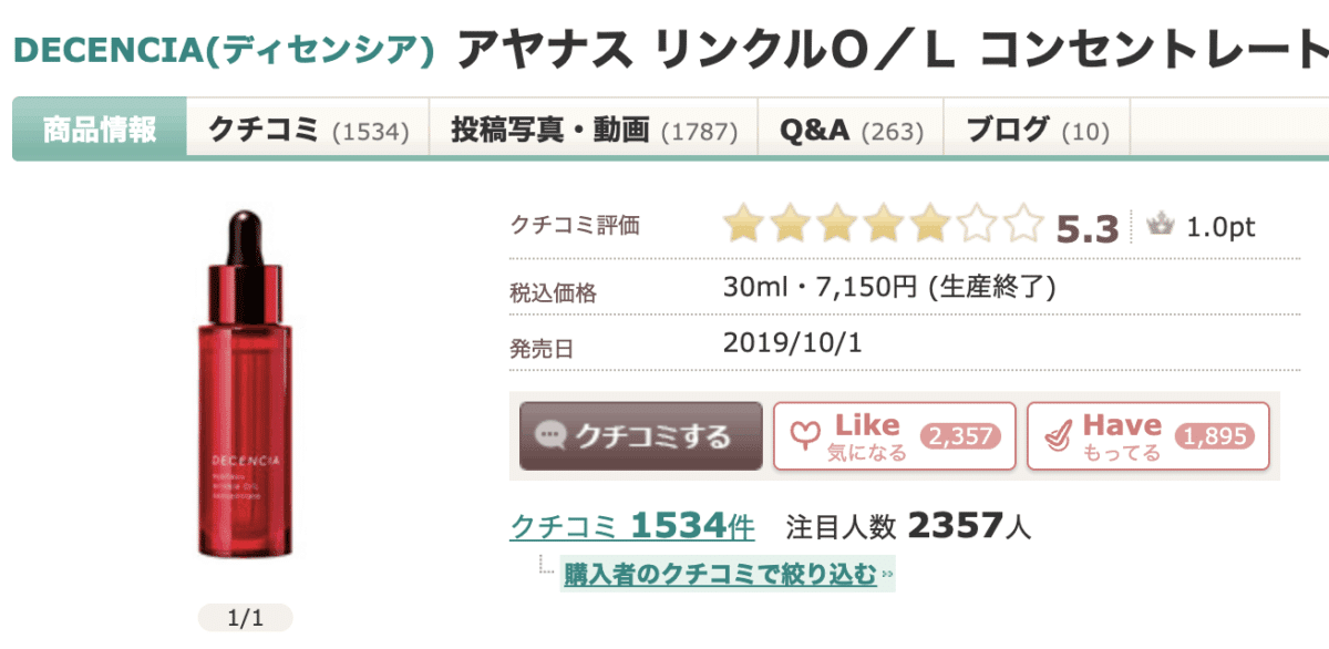 @コスメの口コミ件数は1500件を超え・お気に入り登録数は2,357件という