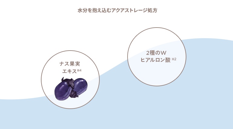 厳選された4種の保湿成分(ヒト型セラミド×Wヒアルロン酸×ナイアシンアミド×ナス果実エキス)が、角層のすみずみまで働きかけます。特に注目は大阪泉州産の水ナス由来の美容成分。通常のナスと比べて圧倒的な水分量を誇る水ナスから抽出したエキスが、みずみずしさを持続させます。
