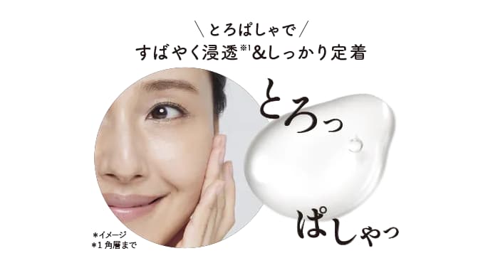 とろっとした濃密なテクスチャーでありながら、肌に触れた瞬間にパシャっとはじけて浸透(※9)(※12)する、まさに”とろぱしゃ“という新感覚の使用感も特徴的です。