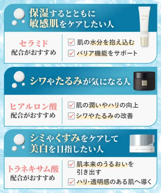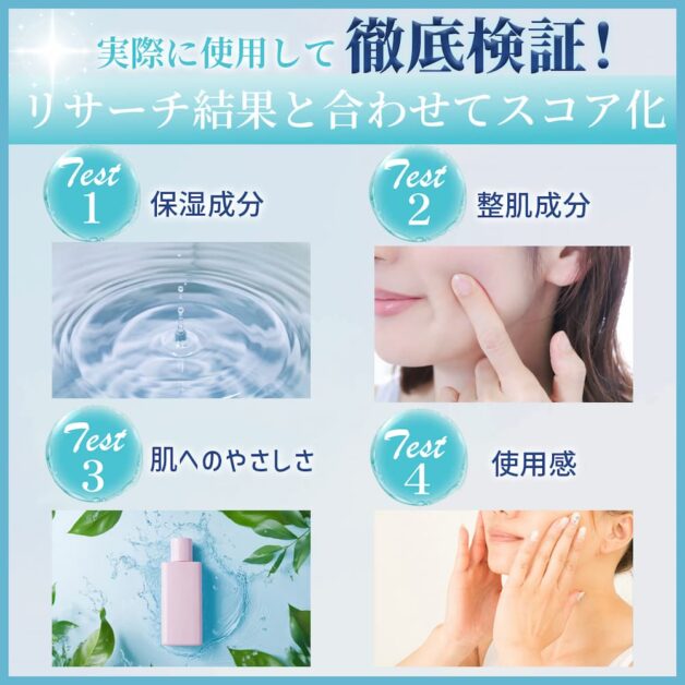 保湿できるのはもちろん、使いやすさや刺激、シワやシミ、たるみに効果のある成分が含まれているかまで細かく調査しました。