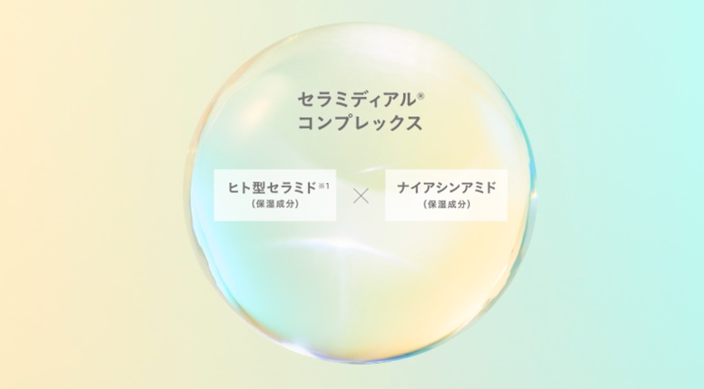 独自開発の「セラミディアルコンプレックス」では、2つの保湿キー成分ヒト型セラミド×ナイアシンアミド)が、角層のすみずみまで働きかけ、乾燥で固くなりがちな大人の肌をやさしくほぐすように整えます
