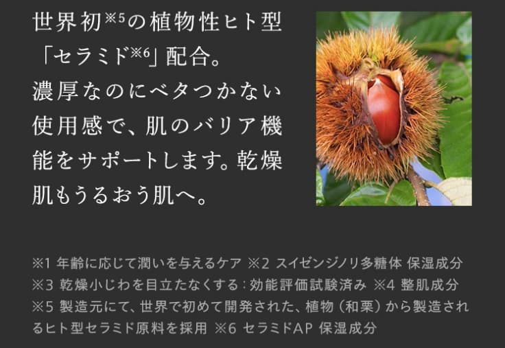 最大の特徴は、和栗の皮から抽出された植物ヒト型セラミドの高濃度配合。一般的な合成セラミドより肌本来のセラミドに近い構造で、臨床試験で約2.5倍の角質水分量向上(*4)を実現しました。