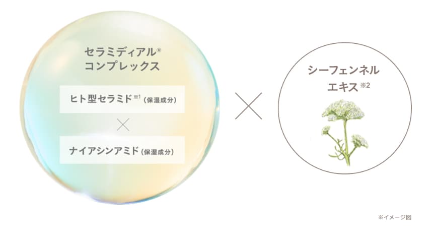 最大の特徴は、セラミディアルコンプレックスによる革新的な保湿システム。5種のヒト型セラミドナイアシンアミドが、角層のすみずみまでうるおいを届ける独自処方です。さらに、シーフェンネルエキスでバリア機能のある角層をサポート。