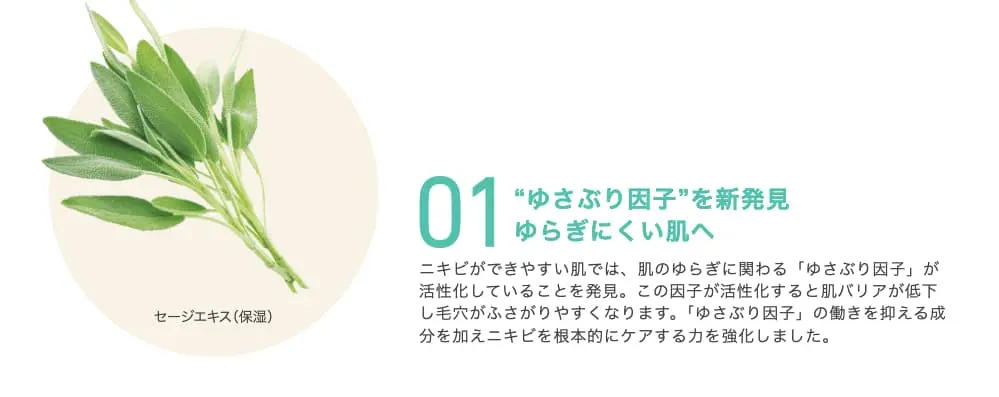 厳選された有効成分「甘草由来成分誘導体(グリチルリチン酸ジカリウム)」を中心に、セージエキスや漢植物エキス、ラフィノース、低分子ヒアルロン酸など贅沢な美肌成分をブレンド。ニキビを防ぎながら、乾燥ダメージから肌を守り、化粧水とは思えない贅沢なニキビケア体験を実現しました。