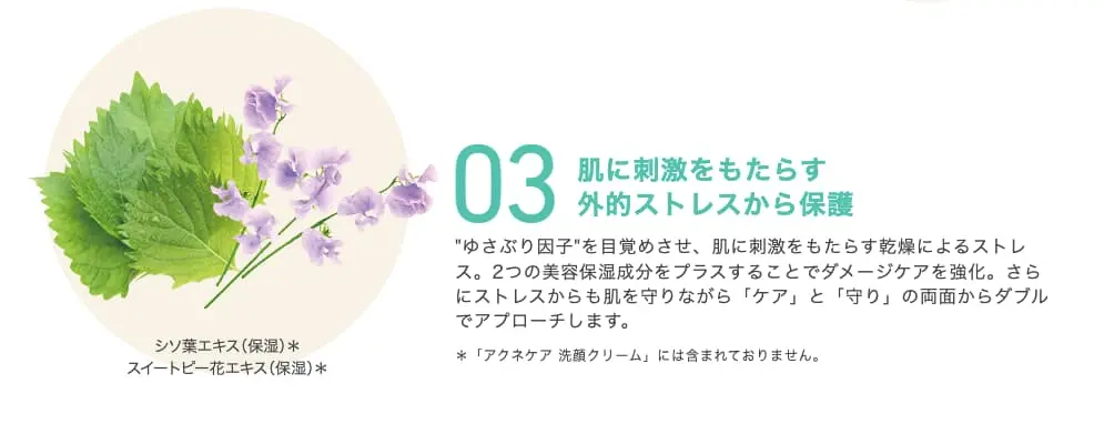 さらに、スイートピー花エキスとシソ葉エキスという2つの美容保湿成分が、乾燥や摩擦などの外的ストレスから肌を守り抜きます。その他には、5大添加物不使用(防腐剤・合成香料・合成色素・石油系界面活性剤・紫外線吸収剤)に加え、ニキビケア化粧品によく使われる殺菌剤さえも使わない徹底ぶり。肌ストレスの元を取り去った、妥協のない優しさにこだわりました。