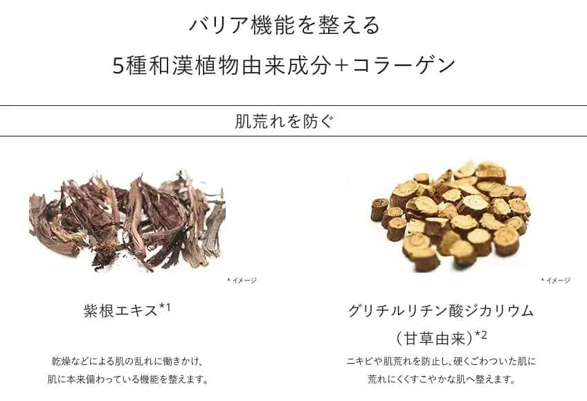 肌に触れた瞬間、バリア機能の低下と毛穴の詰まり(※7)にWアプローチする革新処方採用。医薬部外品の有効成分「グリチルリチン酸ジカリウム(※8)」を中心に、5種の和漢植物エキス(紫根、ハトムギ、アロエ、ヨモギ)が乾燥やゆらぎから肌を守り抜きます。