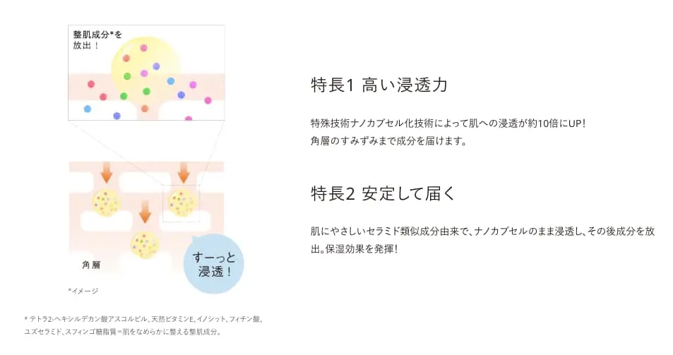 さらに保水型コラーゲンと1nmの「ナノVCショットカプセル(※9)」技術が、肌への浸透力(※10)を約10倍に高め、毛穴の奥までうるおいと有効成分を届ける贅沢処方です。敏感肌の方も使いやすい(※11)のオイルフリー・無香料・無着色処方。アレルギーテスト、パッチテスト、ノンコメドジェニックテスト済み(※12)で、肌への優しさを追求しました。