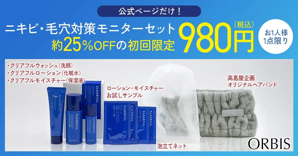 編集部イチオシの理由は、効果実感と続けやすさのバランスにあり。まずは気軽に試せるモニターセットがおすすめです。ニキビ・毛穴対策を本気で始めたい方に、おひとり様1点限りで今なら980円(税込)!さらに今だけ、オルビスオリジナルヘアバンドのプレゼント付き。この機会に、肌悩みから解放される第一歩を踏み出してみませんか?
