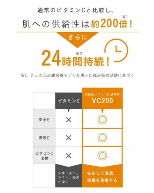 VCローション最大の特徴は他の製品と比べてビタミンCが全く異なる点です。供給型ビタミンC誘導体「VC200」は通常のビタミンCと比較して肌への供給性が約200倍、効果が24時間持続します。一般的なビタミンCが劣化しやすく浸透が遅いのに対し、VC200は安定して浸透し効果を発揮します。