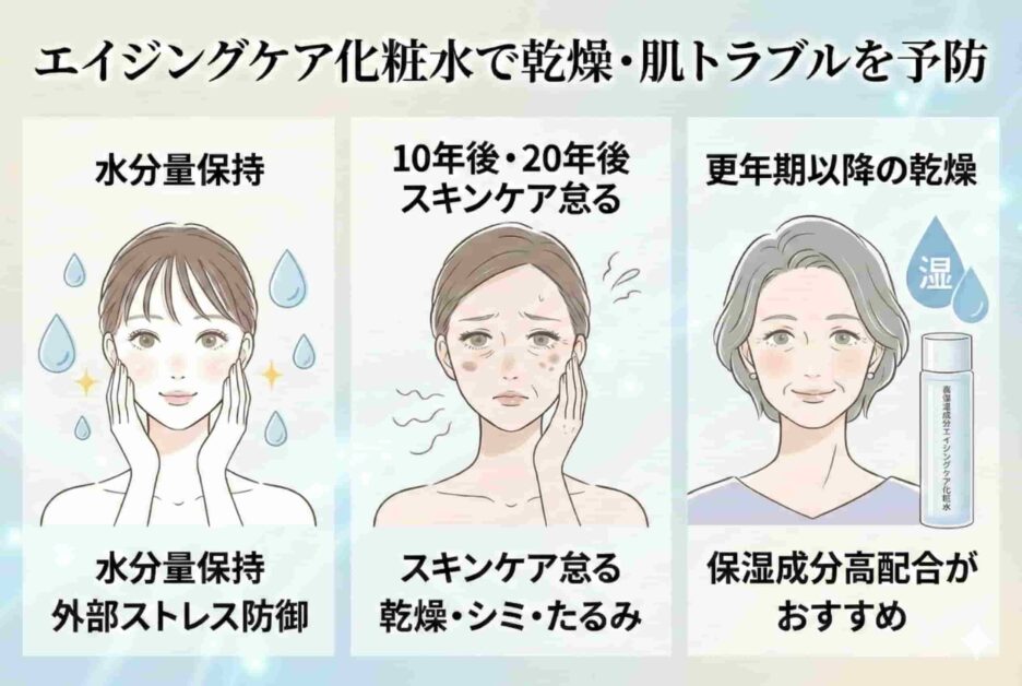 更年期以降、さらに肌の乾燥が気になってくるので保湿成分を多く含むエイジングケア化粧水を使用するのがおすすめです。