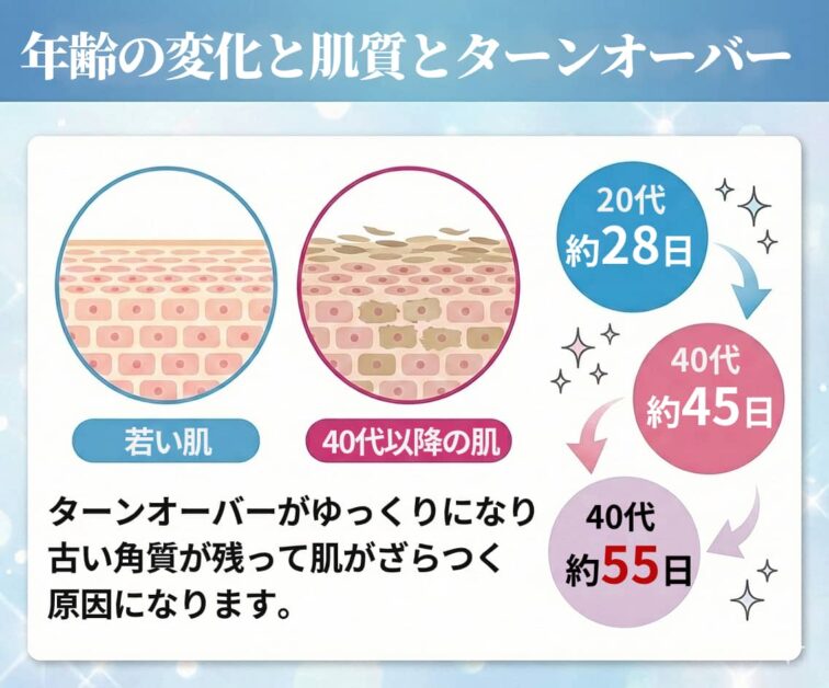 ターンオーバーが遅れると古い角質が残り、肌がざらつく原因になります。