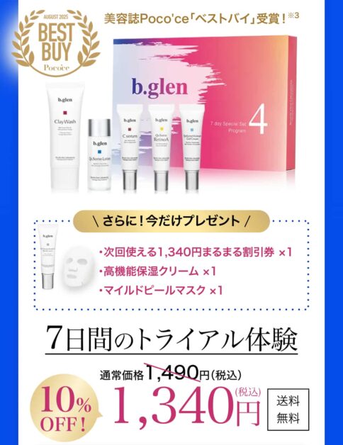 bglenでは、毛穴化粧水を含むスキンケアを試せる7日間トライアルセット(1,340円・税込/送料無料)が用意されています。定期購入のしばりがなく、365日間の返金保証もあるため、詳細は公式サイトで条件を確認してみてくださいね♪