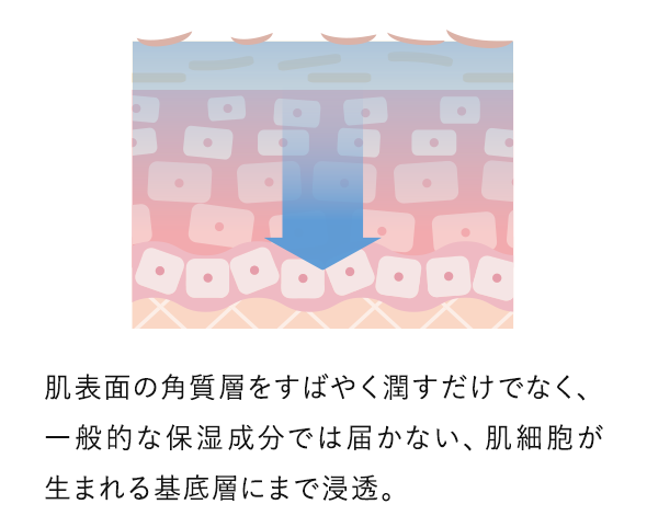 角質層のさらに奥にある基底層まで浸透する仕組みに着目した研究背景をもとに設計されています。