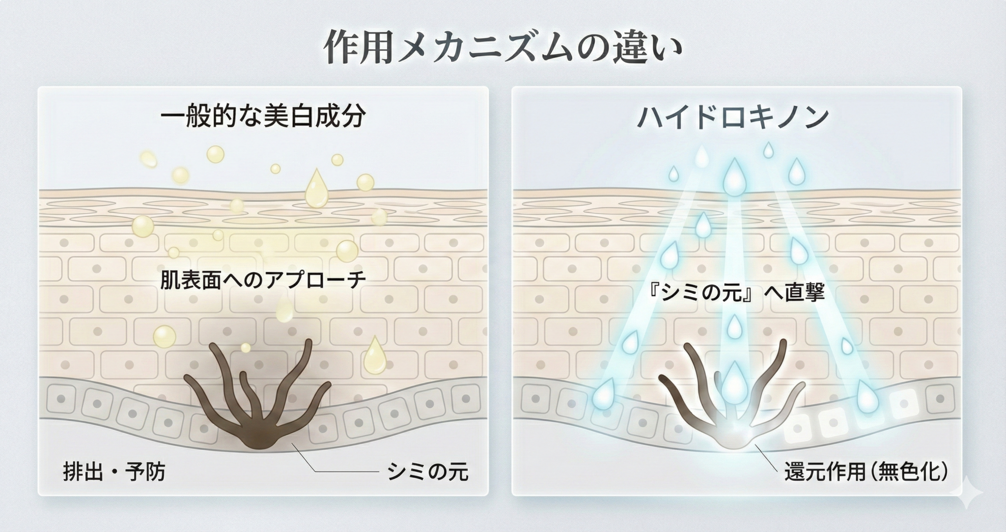 美白成分は通常シミの「予防」に対してのみ効果があります。しかしハイドロキノンは、メラニンを淡色化し今あるシミを薄くする力があるんです。