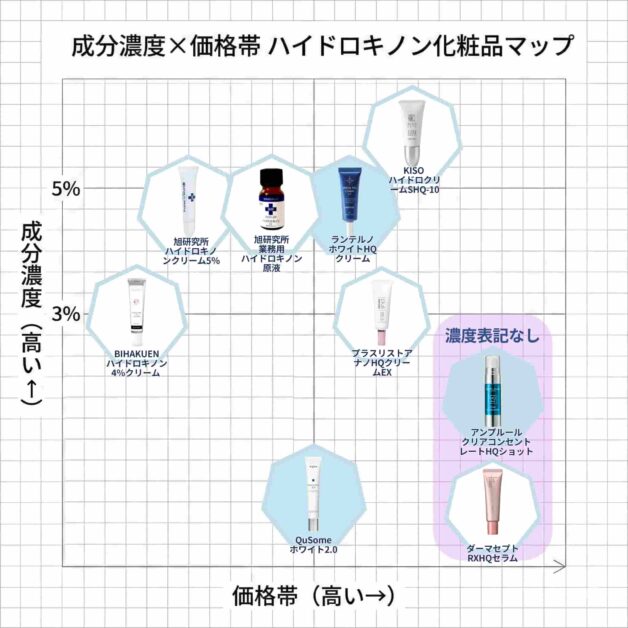 今回、各商品の純ハイドロキノン濃度と値段(1gあたり)を調べて、わかりやすいよう表にまとめました!