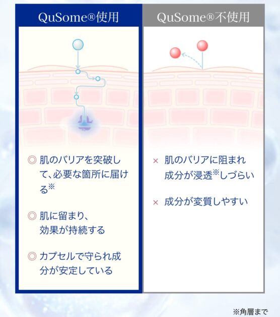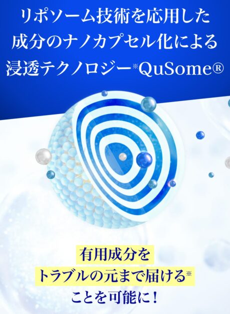 特徴のひとつが、成分を配合するだけで終わらせず、「どう届くか」という点まで踏み込んだつくりです。ビーグレン独自のQuSome®テクノロジーにより、整肌成分を角層まで届けることを目指した処方を採用しています。成分をナノカプセル化することで、日常的なケアの中でも扱いやすい形に整えられています。