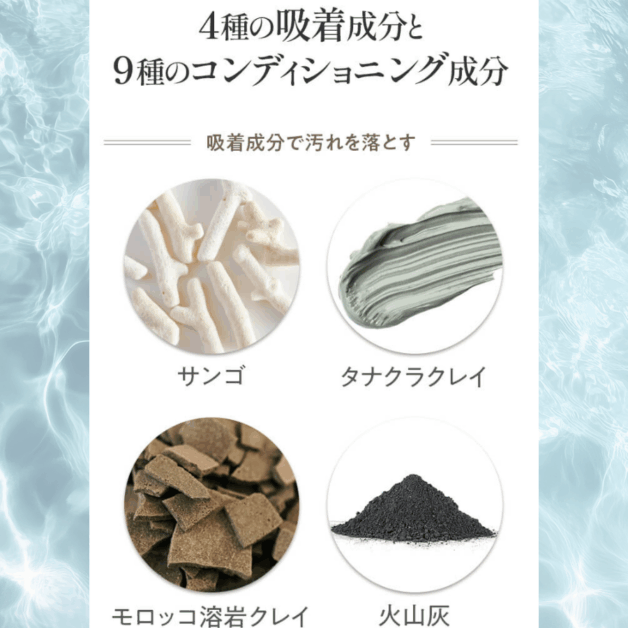 クレイを含む4種の吸着成分(サンゴ、タナクラクレイ、モロッコ溶岩クレイ、火山灰)で頭皮の汚れをしっかり吸着・除去。泡立たないクリームシャンプーでも、すっきりとした洗い上がりを実現します。