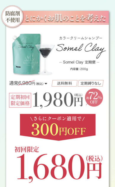 カラークリームシャンプー Somel Clayは200g入り。通常価格は6,980円(税込)のところ、定期初回限定価格が約72%OFFの1,980円(税込・送料無料)!