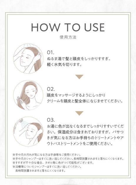 使用を重ねるごとに、艶のある美しい髪色に近づいていきます。ノンシリコン、無添加なので、毎日のシャンプーとしても安心してお使いいただけます。
