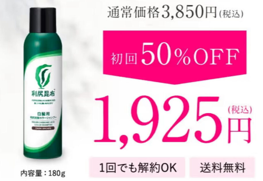 利尻炭酸カラーシャンプーの通常価格は3,850円(税込)ですが、定期おトク便の初回なら50%OFFの1,925円(税込)でお試しいただけます。さらに、2回目以降は10%OFFの3,299円(税込)でお求めいただけます。
