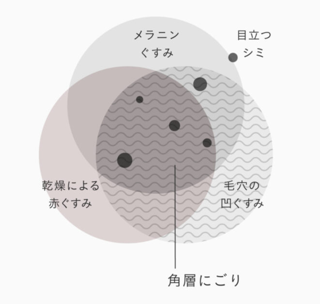 その正体は、メラニンによるくすみに加え、乾燥による「赤ぐすみ」や毛穴目立ちによる「凹ぐすみ」が重なって生まれる「角層にごり」。