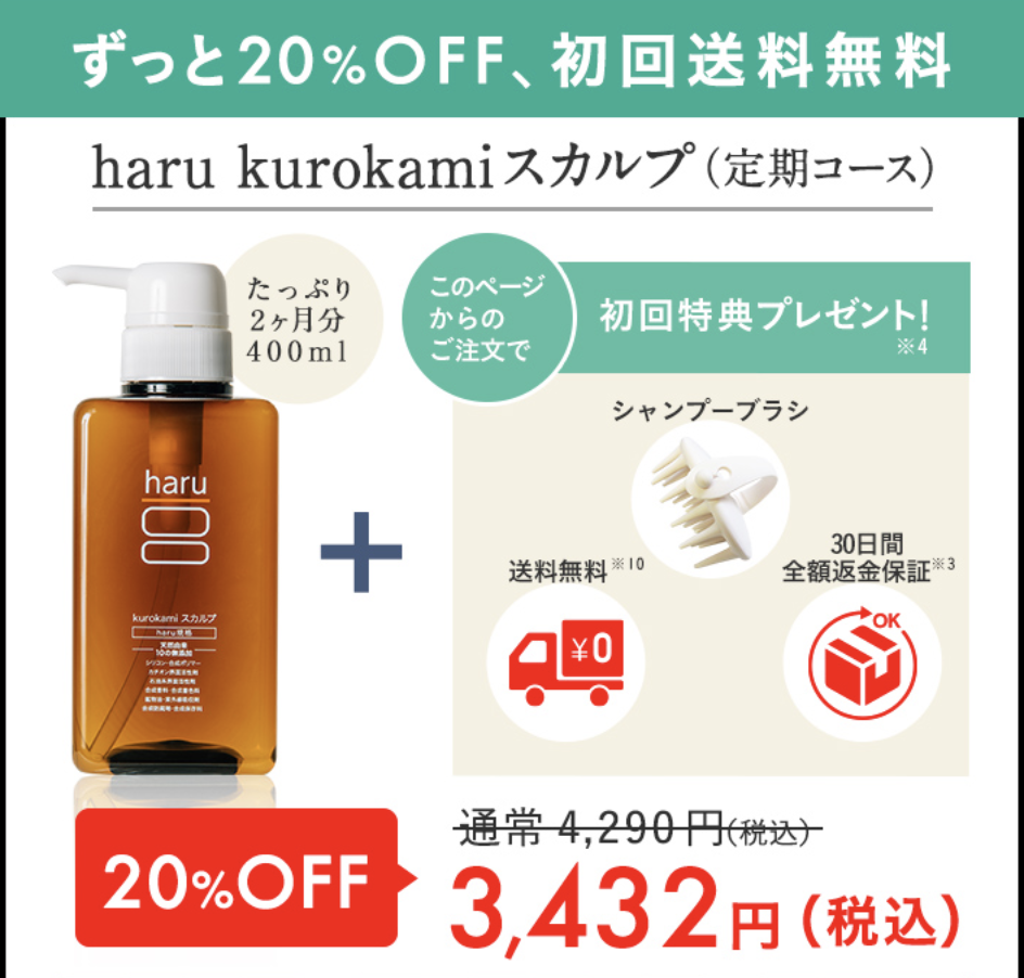 haru kurokamiスカルプは通常価格4,296円(税込)のところ、定期購入なら20%OFFの3,256円(税込)でお求めいただけます。さらに初回特典プレゼントで、リフレッシュシャンプーブラシがセットで付いてくる、大変お得なキャンペーン中です!