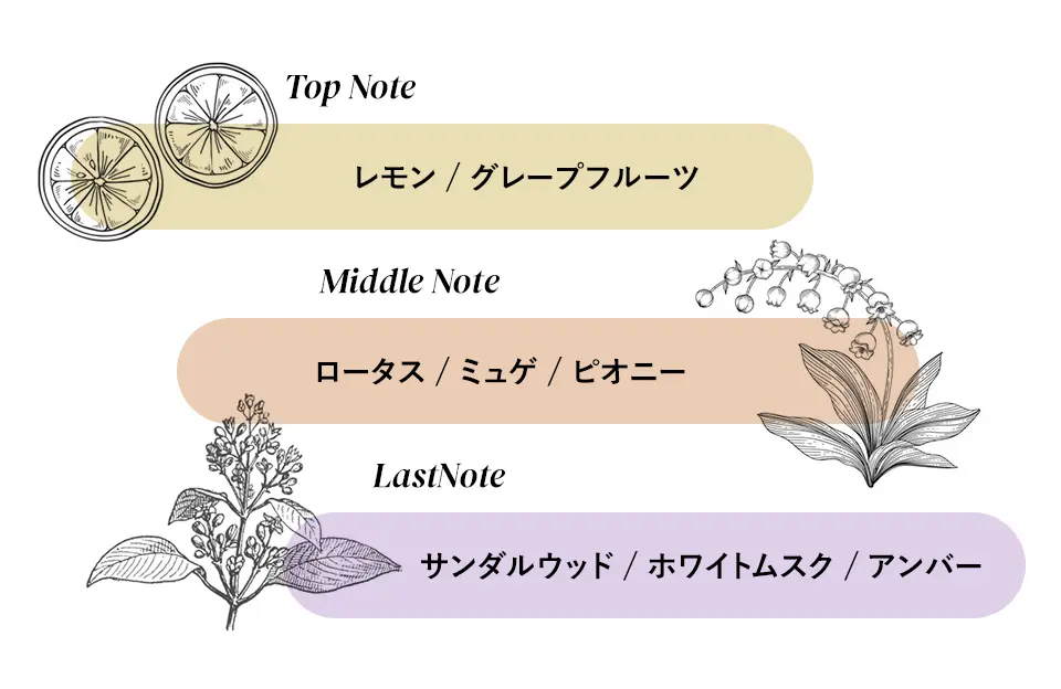 | 香り | 優しい柑橘系 の香り | ベルガモット アールグレイ | 心地よいボタニカル フローラルの香り | フレッシュウッディ 調の香り | 5種類の香りから 選択可能 |