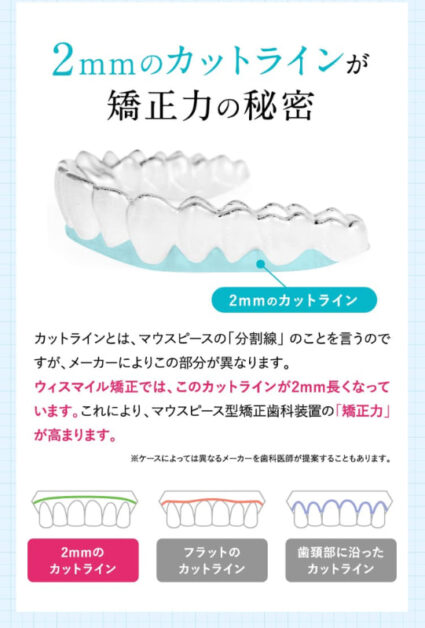 WE SMILEが開発した独自の2mmカットライン技術が矯正力の秘密です。マウスピースの分割線を2mm長くすることで、従来のマウスピース矯正装置の矯正力を大幅に向上。さらに、特殊な光沢防止加工により、装着していても気づかれにくい仕上がりを実現。痛みを軽減しながらも、従来から進化した圧倒的な矯正力を発揮します。