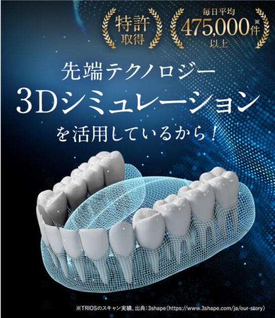 ※1 2024年4月30日時点 ※2 インビザラインについて、メーカーとしてシェア№1 ※3 TRIOSがCELLERANT BEST OF CLASS TECHNOLOGYを受賞 ※4 治療期間には個人差があります ※5 2024年5月時点、一部提携クリニックのみ ※6 コース、分割回数により変動 ※7 1回お試しマウスピースは、あくまでも装着感を試すもので、矯正治療効果はありません