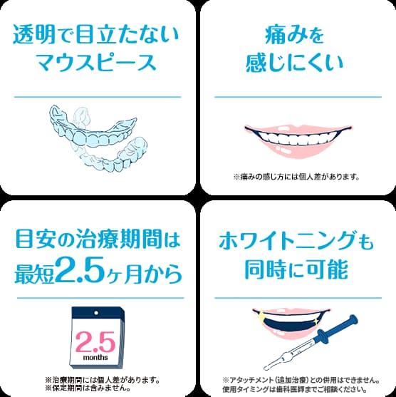 商品説明 専属医療チームがサポート 最低2回の通院で治療可能 次世代マウスピースで スピード治療3倍速 ホワイトニングも同時に可能な目立たない矯正