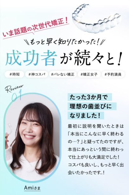 「たった3ヶ月で理想の歯並びになりました!最初は本当にこんなに早く終わるのかなと疑っていましたが、あっという間に終わって仕上がりも大満足です」(Ami様)※個人の感想であり、効果を保証するものではありません