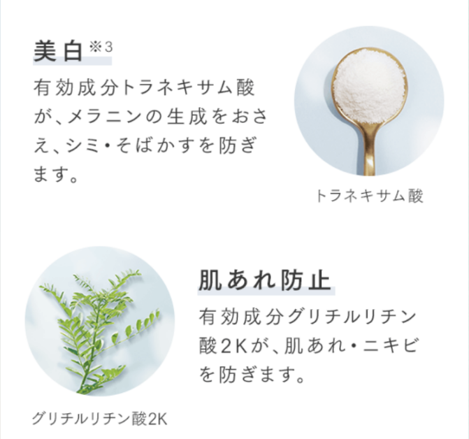 美白有効成分トラネキサム酸+肌あれ防止有効成分グリチルリチン酸2Kを配合。キメを整え、みずみずしく透明感のある肌へ導きます。