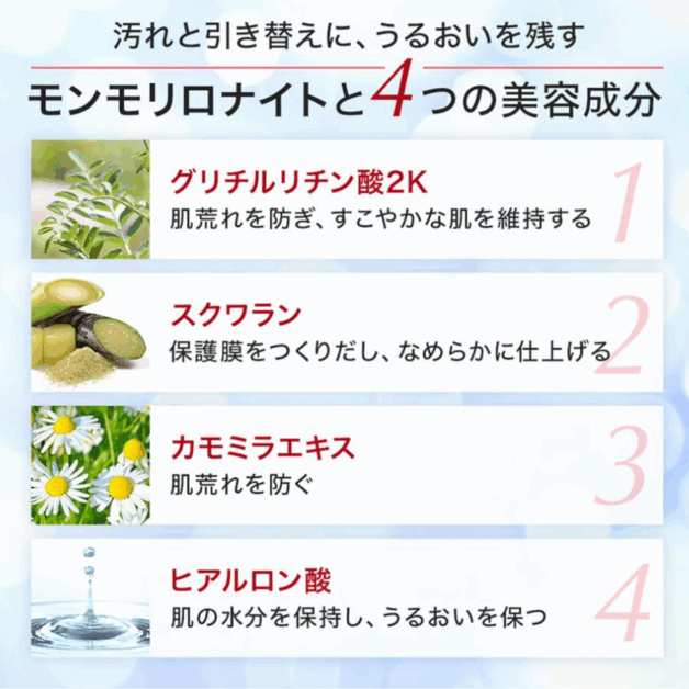 注目ポイント 天然クレイ「モンモリロナイト」による泡立て不要の吸着洗顔。汚れだけを吸着し、うるおいは残します。