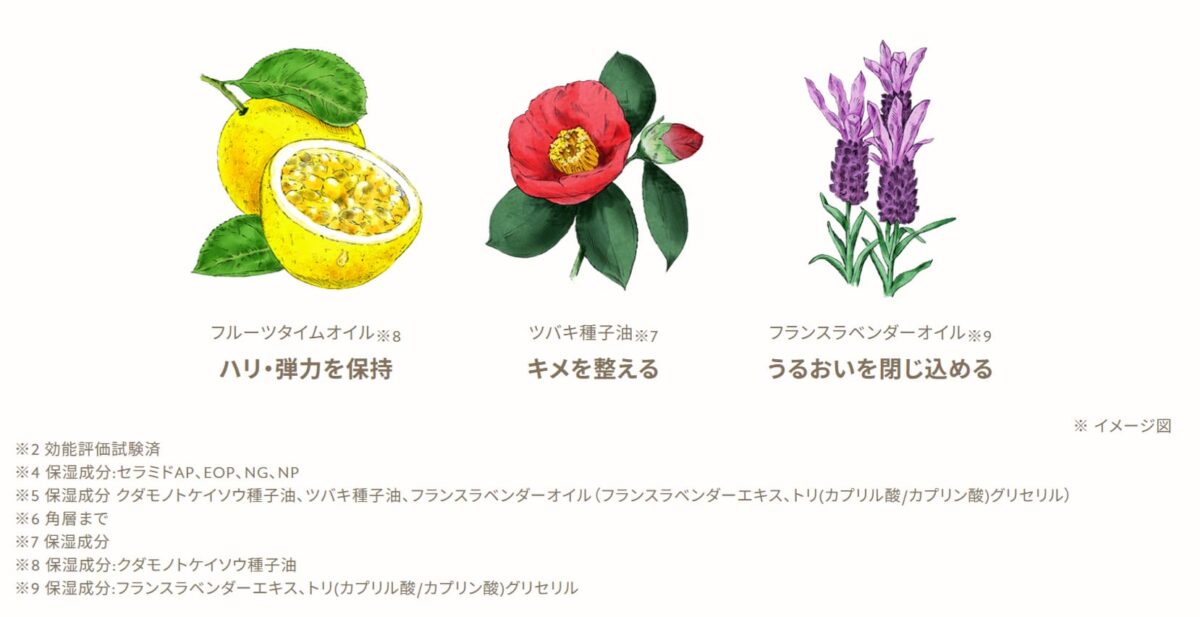 さらに、フルーツタイムオイルツバキ種子油フランスラベンダーオイルを絶妙な比率でブレンドしたオリジナルオイルが、ハリ・弾力、キメ、うるおいをトータルにケアします。